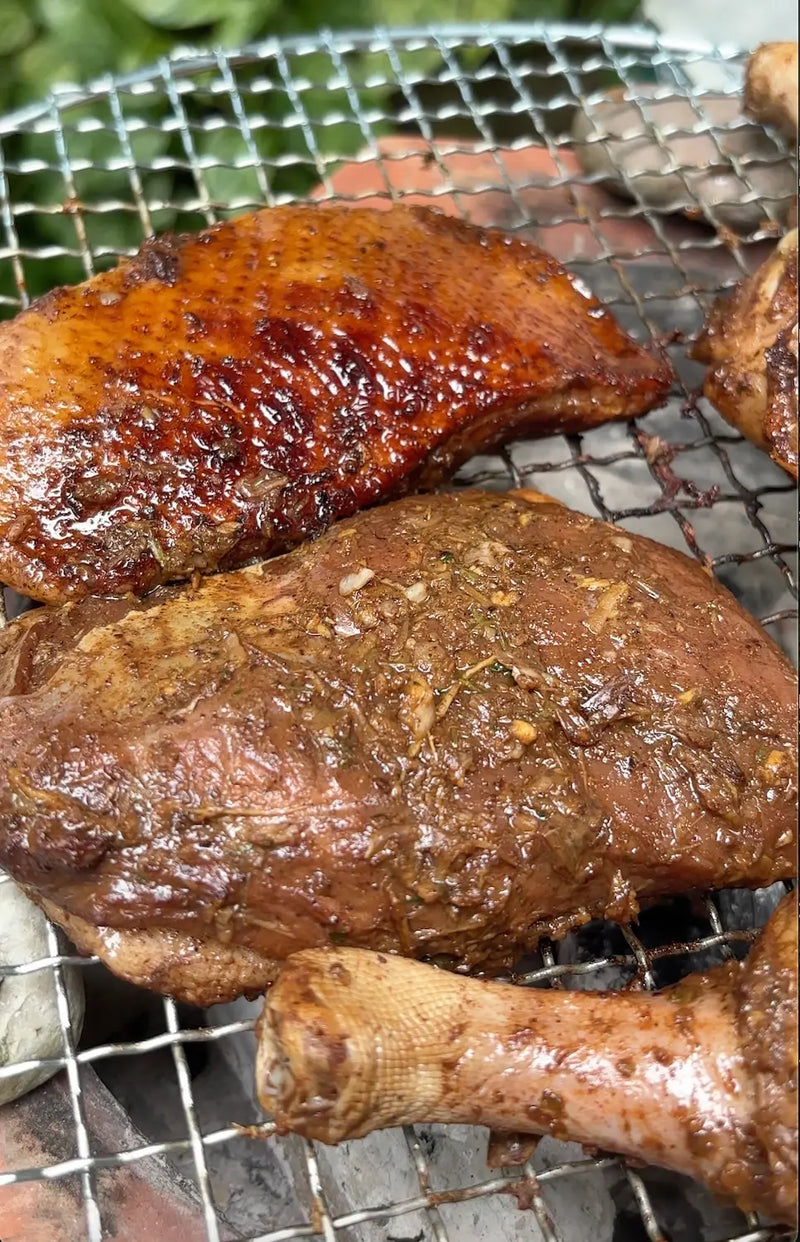The grilled duck marinade is aromatic and deeply savory, combining coriander root, garlic, ginger, toasted coriander seed, white pepper, and five-spice with soy sauces, oyster sauce, and a touch of sugar. It seasons the duck thoroughly, enhancing its natural richness before grilling.