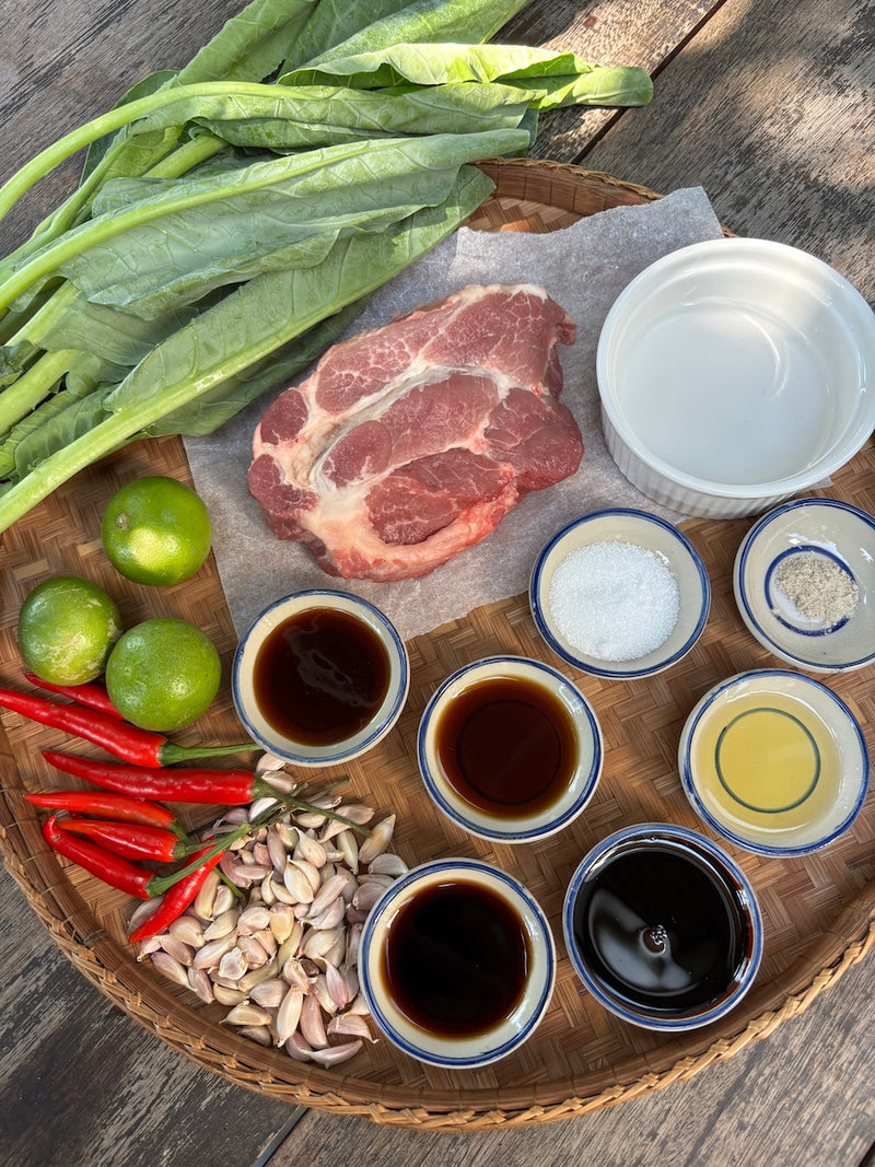 A fast, savory Thai stir-fry of tender pork, crisp kale, and a punchy garlic-chili base cooked over high heat. Each bite is aromatic and balanced, with gentle heat, light sweetness, and just enough sauce to coat everything beautifully.