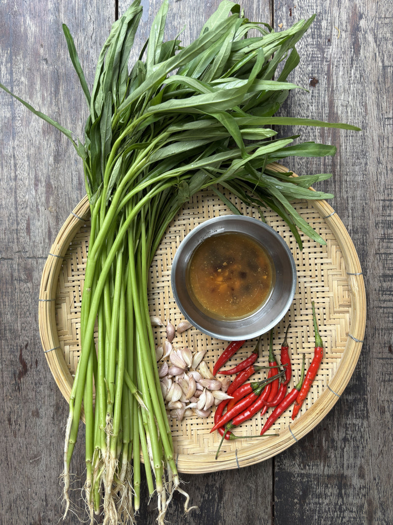 A lightning-fast Thai street-style stir-fry. Crisp morning glory flash-fried with garlic, chilies, and savory sauces over roaring heat. Bold, smoky, and ready in seconds.