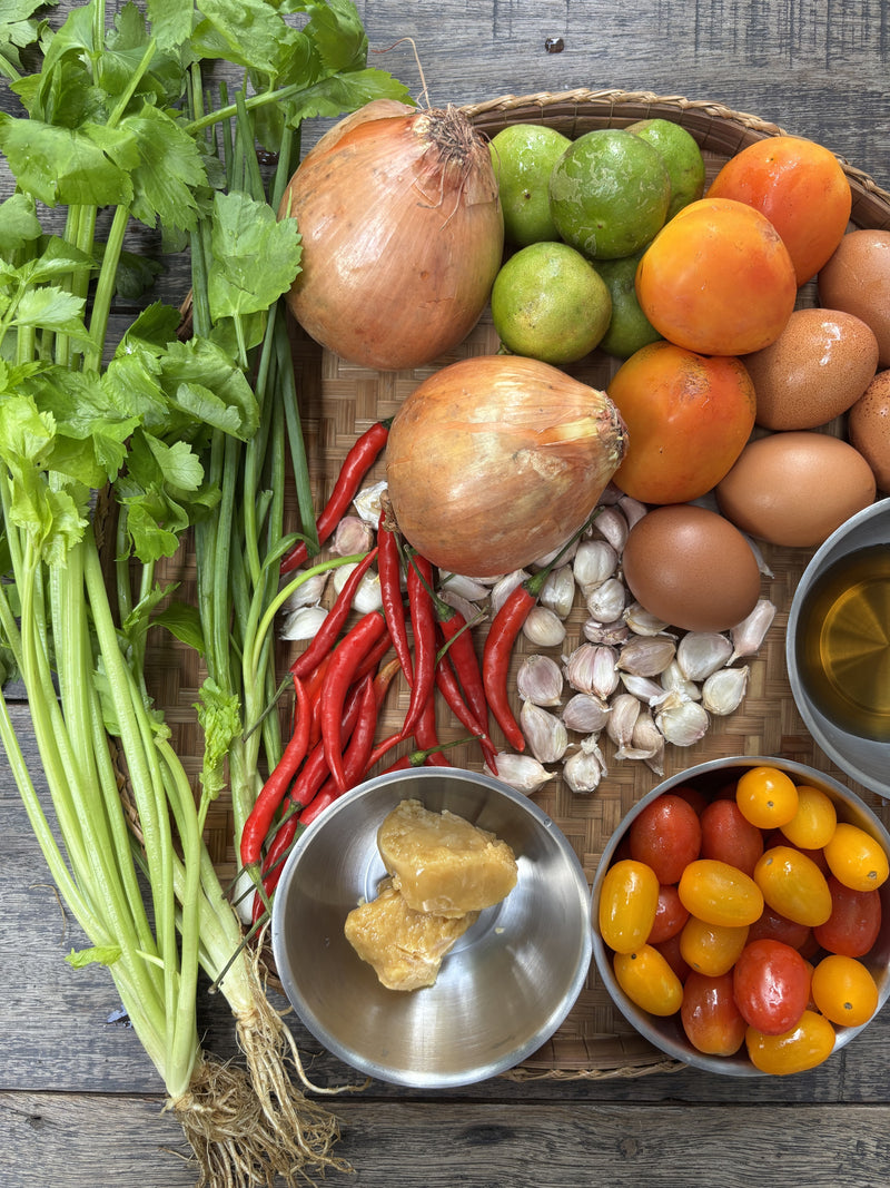 A Thai-style salad made with crispy fried eggs (khai dao) tossed in a bold, zesty dressing of fish sauce, lime juice, chili, and shallots.