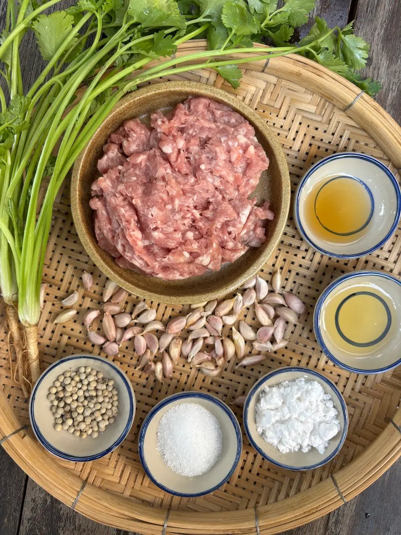 Fragrant Thai pork meatballs infused with freshly pounded sam klur—coriander root, garlic, and white pepper—then fried until golden and topped with crispy garlic. Aromatic, gently spiced, and balanced with a touch of sweetness, this is Thai comfort food at its best.